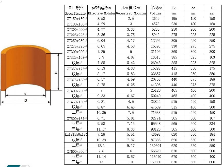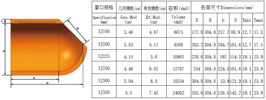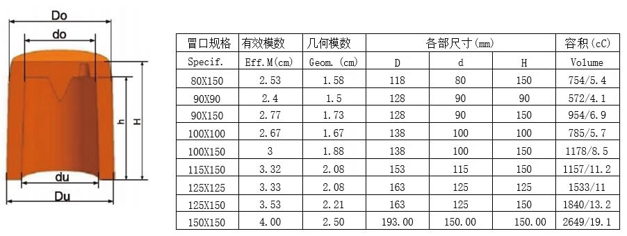 3、从附表中选择合适型号的冒口。其中有效模数为该冒口套在正常情况下能够达到的最大模数,几何模数为 同尺寸砂型冒口的模数。
