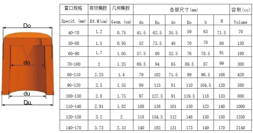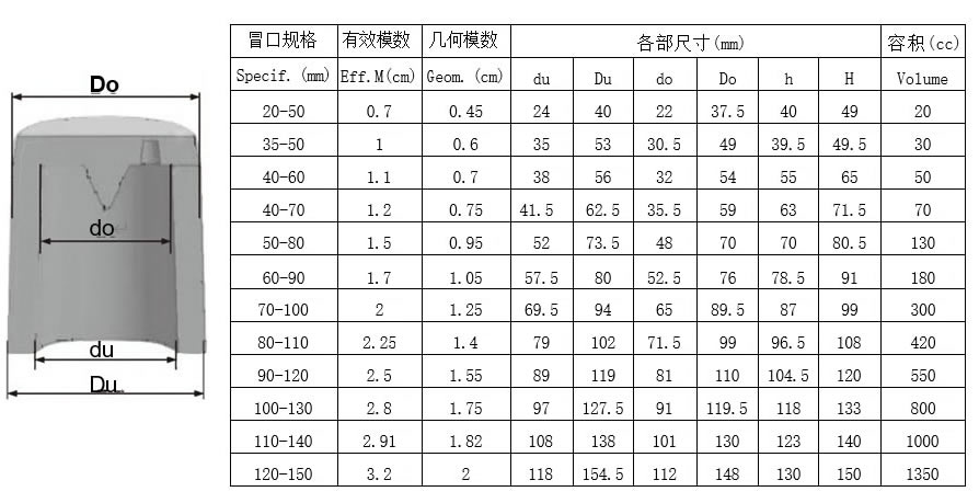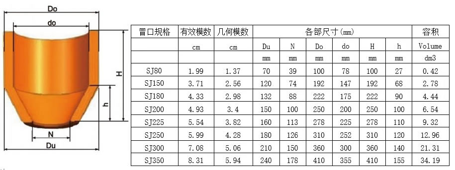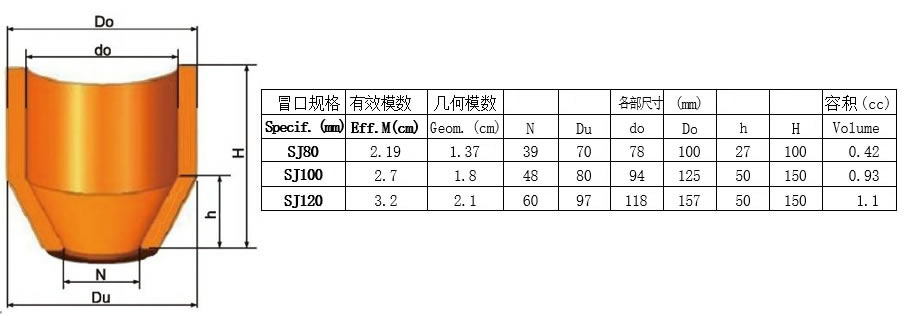 3、从附表中选择合适型号的冒口。其中有效模数为该冒口套在正常情况下能够达到的最大模数,几何模数为 同尺寸砂型冒口的模数。